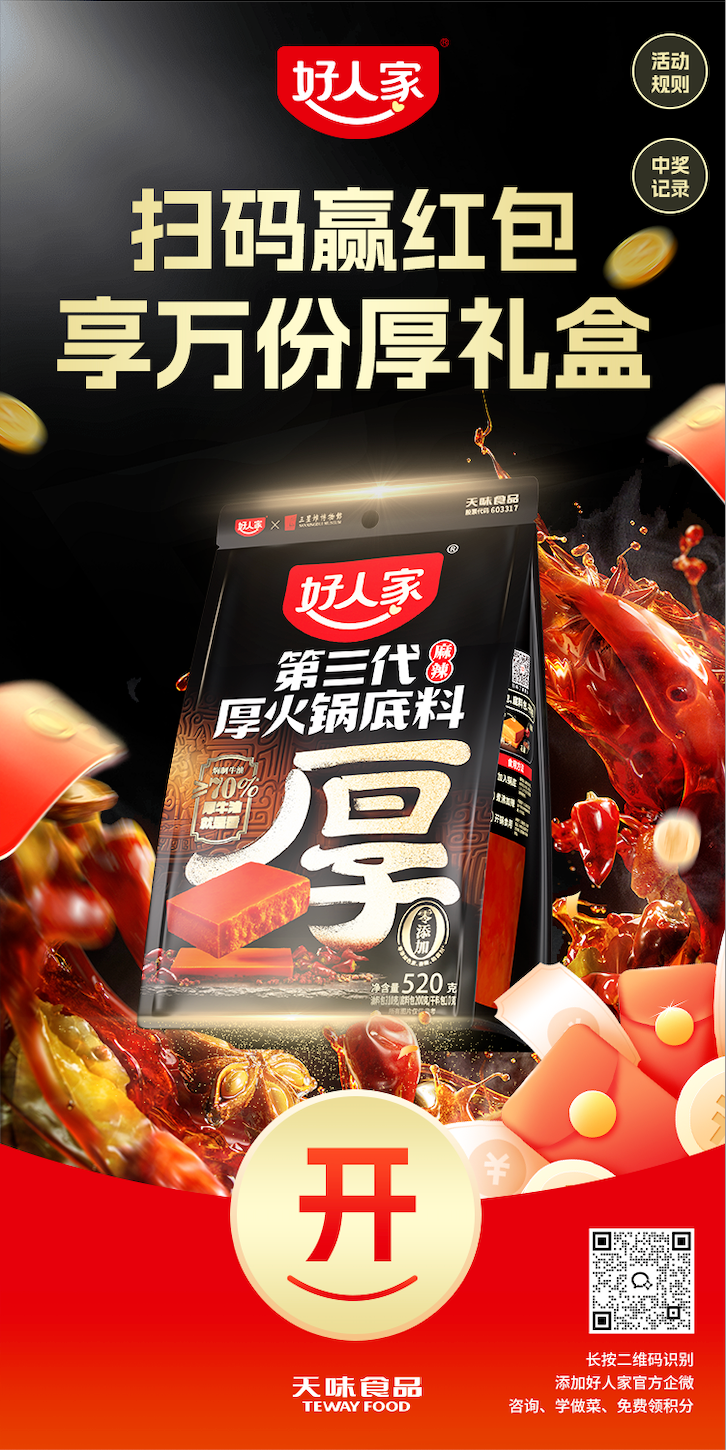 天味·好人家“扫码赢红包,享万份厚礼盒”活动期间,用户购买手工火锅底料促销装后,用微信扫一扫功能扫描袋内的奖卡二维码,即可进入“好人家手工火锅”H5界面,用户授权后即可进入活动页面,参与抽奖。除了有机会获得红包奖励外,还有机会赢得好人家-第三代厚火锅底料礼盒一份。