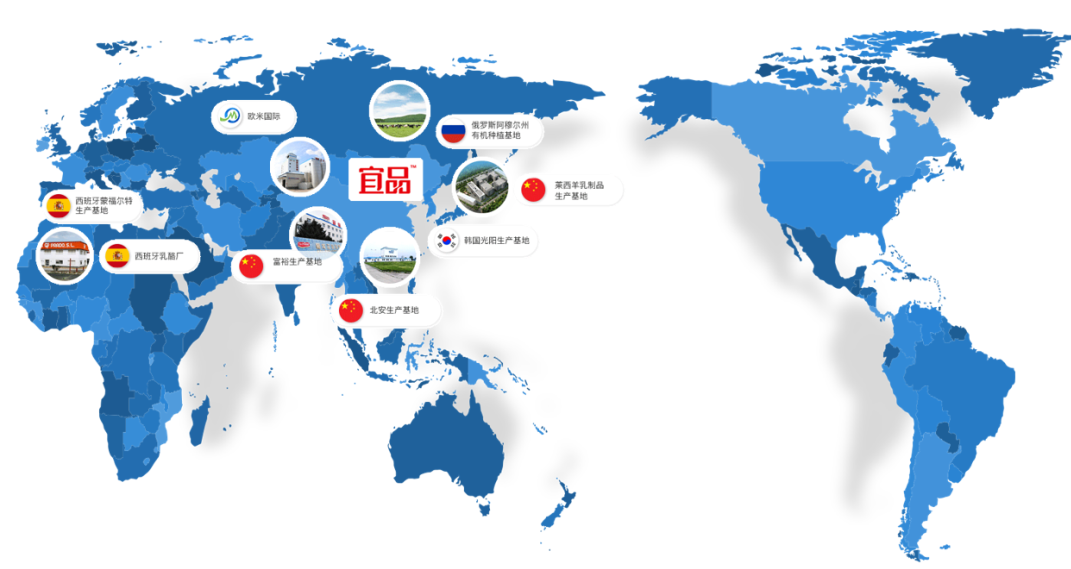 宜品已在全球建设超过8个生产基地,实现了从牧草种植、牧场养殖、产品研发、产品加工、实验检测、终端销售、客户服务的全产业链布局,完成了从婴配奶粉、成人奶粉、营养品到乳品原料的多元化乳制品产业结构。