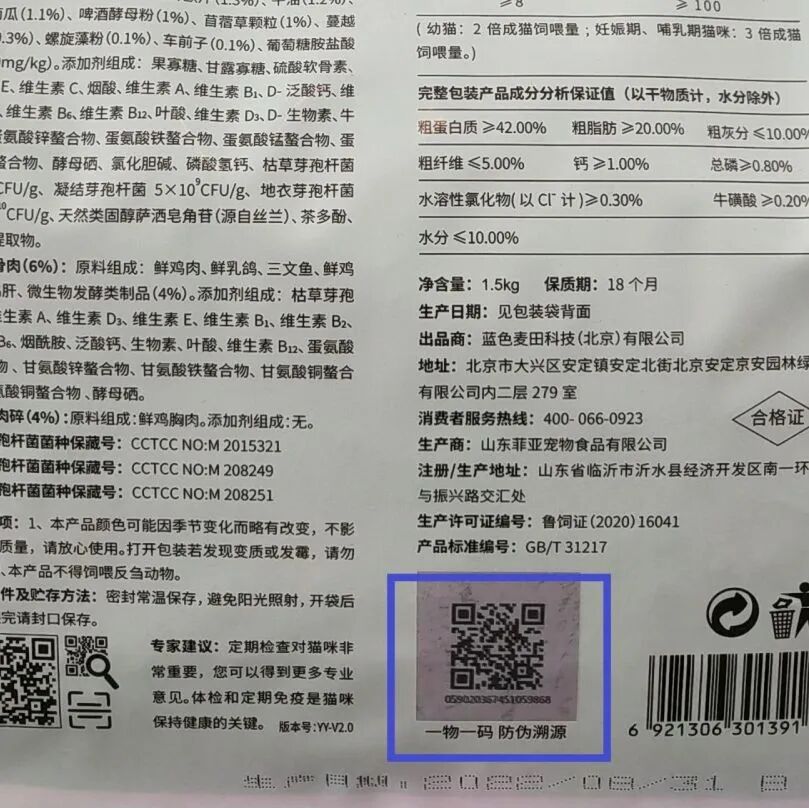 CCN中商以一物一码技术,在每一包蓝氏猫粮包装背面印上产品溯源码,用户可以扫码查验真伪,追溯原料来源和检测报告,真正做到安全、透明,让养宠人更放心。