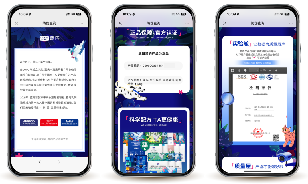 为了严格产品质量,提升消费者对品牌的信任度,蓝氏宠粮不仅符合中、美、欧三重检测标准,且每批次产品均可以向消费者提供第三方检测报告。近年来,蓝氏携手CCN中商以一物一码技术,在每一包蓝氏猫粮包装背面印上产品溯源码,用户可以扫码查验真伪,追溯原料来源和检测报告,真正做到安全、透明,让养宠人更放心。